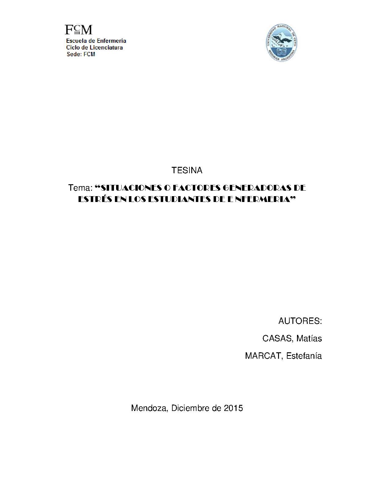 Casas, Matias; Marcat, Estefanía. (2015). Situaciones o factores generadoras de estrés en los estudiantes de enfermería: (Tesina de grado). Mendoza, Universidad Nacional de Cuyo. Facultad de Ciencias Médicas. Escuela de Enfermería..