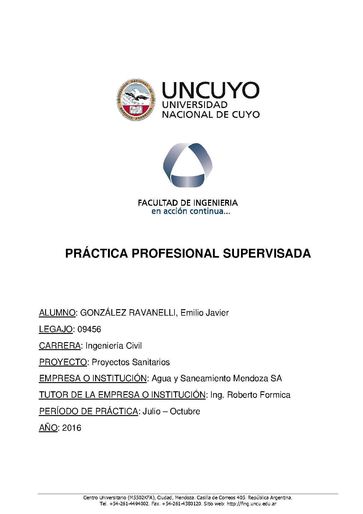 En el presente informe se presenta una descripción sobre los trabajos desarrollados en la Práctica Profesional Supervisada de la Carrera de Ingeniería Civil, en la empresa “Agua y Saneamiento Mendoza S.A." (AySaM S.A.).