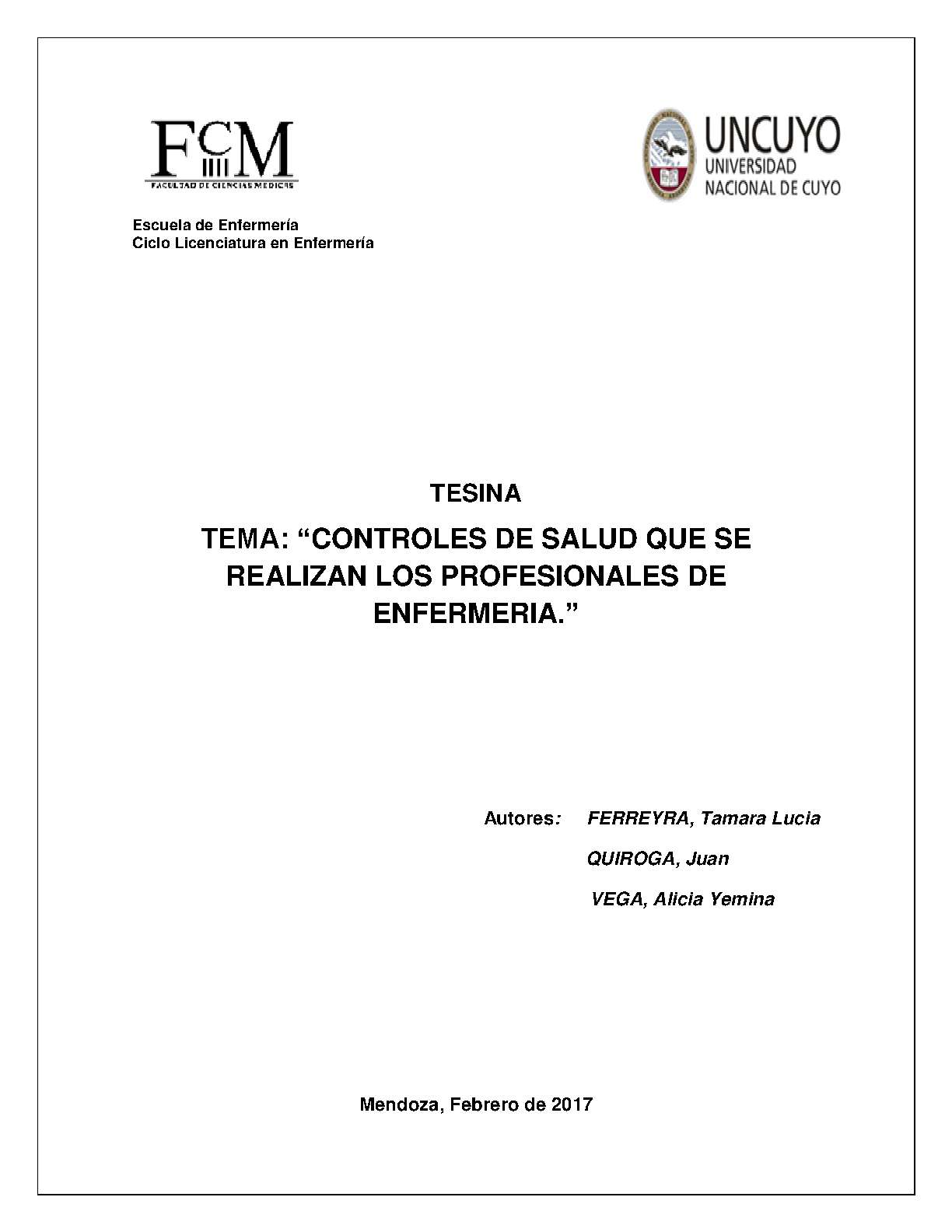Ferreyra, Tamara Lucía; Quiroga, Juan; Vega, Alicia Yemina. (2017). Controles de salud que se realizan los profesionales de enfermería: (Tesina de grado). Mendoza, Universidad Nacional de Cuyo. Facultad de Ciencias Médicas. Escuela de Enfermería..