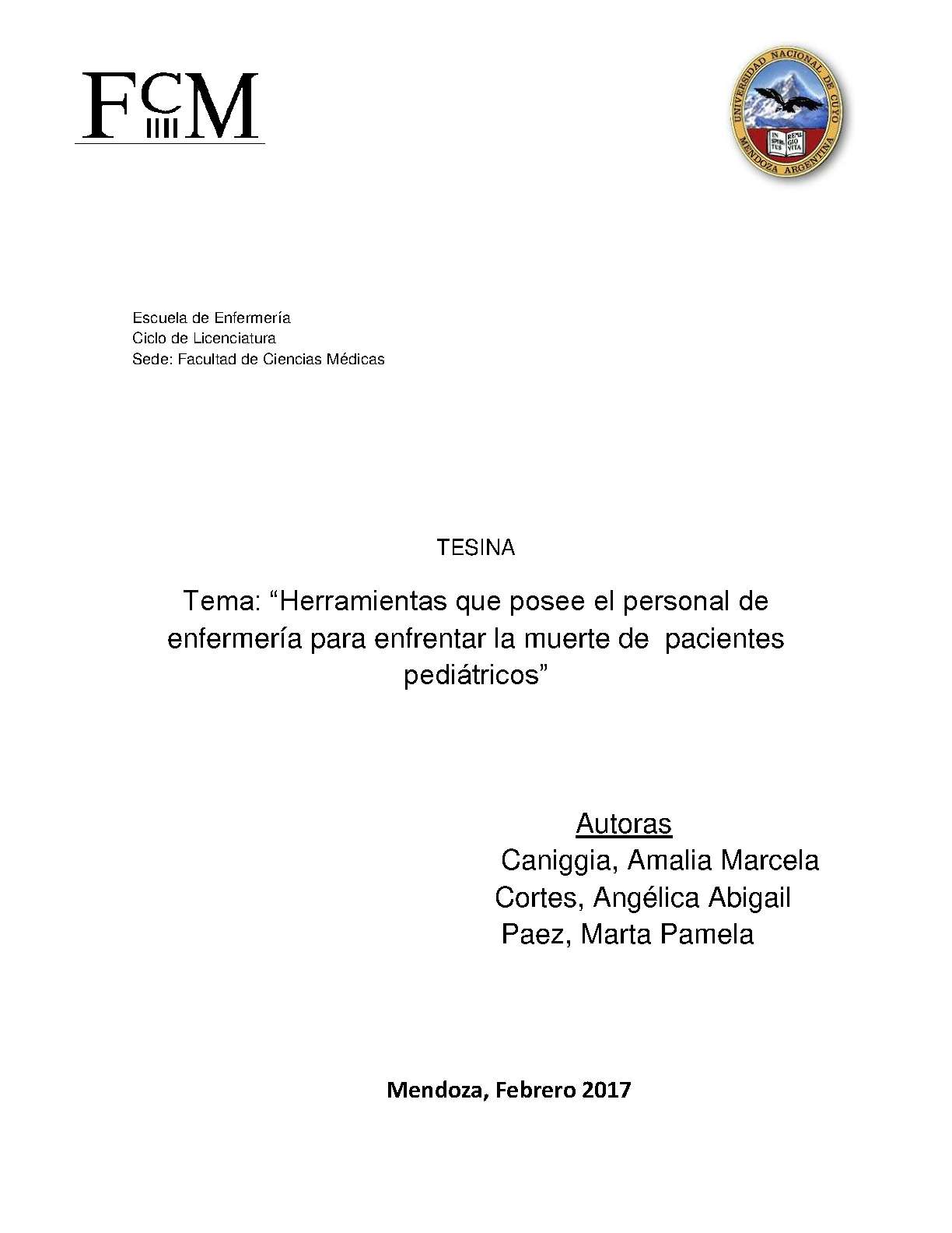 Experimentar la muerte de un niño es un proceso complejo, el cual resulta en numerosas ocasiones difícil de enfrentar, debido a que comprende una experiencia individual, privada e intransferible. Igualmente es una expresión compleja que involucra aspectos biológicos, sociales, legales y religiosos, siendo un suceso dramático, difícil de admitir pues ocurre al principio de la vida. Es generador de ansiedad, dolor, sufrimiento e ira en el entorno familiar, situación inevitable que en ocasiones debe ser aceptada con resignación. Así la muerte se considera como una realidad que atemoriza, donde la huella que deja en las(os) enfermeras(os) es inevitable. Dado que el ejercicio profesional implica el enfrentar las demandas constantes de los familiares, la agonía, el dolor, el sufrimiento y, finalmente la muerte de los pacientes, se hace necesaria una formación específica, en donde los aspectos psicológicos y emocionales cobren especial relevancia. En estas situaciones el enfermero adopta distintas actitudes de afrontamiento, tanto positivas como negativas. Este trabajo de investigación tiene como objetivo determinar cuáles son las herramientas que posee el personal de enfermería del Hospital Humberto Notti, de los servicios de clínica pediátrica y neonatología para enfrentar casos de muertes pediátricas de diferentes patologías infantiles durante el segundo semestre del año 2016. La muestra fueron 30 enfermeros de los servicios de internación pediátrica (l,ll y lll), UTI Y NEO de dicho hospital.