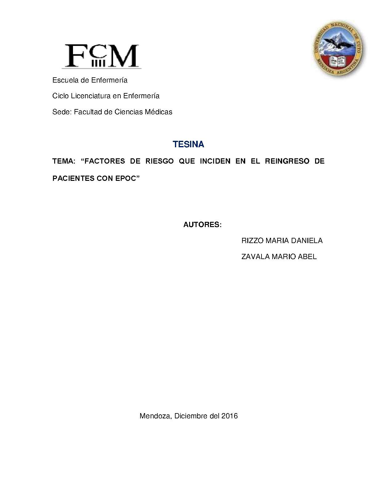 A lo largo de la profesión un enfermero debe contener y brindar cuidados a diferentes personas que padecen una diversidad de patologías muy amplias, entre las cuales se encuentra la Enfermedad Pulmonar Obstructiva Crónica (EPOC), patología que es muy habitual en nuestra sociedad y es una de las principales causas de muertes a nivel mundial. Es de vital importancia el compromiso del profesional con el paciente y su entorno familiar; además de satisfacer las necesidades biológicas Es tarea del enfermero valorar a la persona en todos sus aspectos como; relaciones familiares, lazos afectivos, preocupaciones, miedos, ansiedad, estableciendo vínculo de confianza para lograr el compromiso del paciente con su tratamiento. Los periodos de internación de los pacientes van a repercutir tanto en su ámbito familiar directo, personas cercanas, equipo de salud y a la provincia en sí, debido a los gastos que los tratamientos demandan. Con respecto al equipo de salud, este puede sentir frustración en algún punto por el hecho de que muchos de los factores causales de la reinternación dependen de las malas decisiones propias de los pacientes Este trabajo de investigación tiene como objetivo determinar qué factores inciden en la reinternación de pacientes con EPOC en los servicios de clínica médica este y oeste del Hospital Lagomaggiore durante el segundo cuatrimestre del año 2016. Es una investigación de tipo cuantitativa con una fuente de información documental (archivos e historias clínicas) y de caso (cuestionario). El universo fue de 40 pacientes que presentan EPOC y 30 enfermeros de los servicios de clínica de dicho hospital.