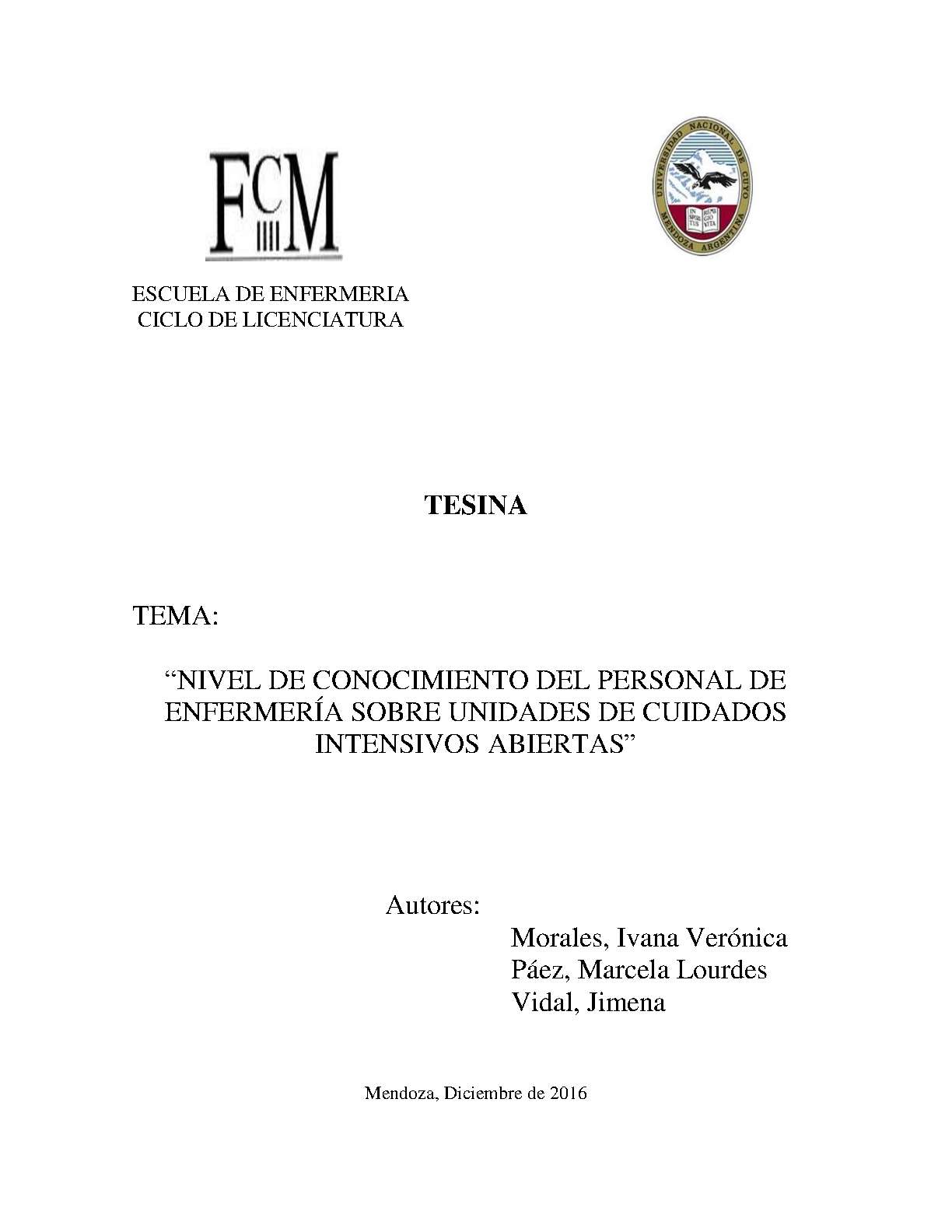 En las Unidades de Cuidados Intensivos Abiertas el trato es más humanizado, el familiar acompaña en forma continua a su ser querido y ayuda a que la recuperación sea más rápida o a estar en los últimos momentos de la vida del mismo. De esta manera el familiar se convierte en una ayuda para el personal de salud y no un estorbo. El personal de enfermería que trabaja en Unidades de Cuidados Intensivos (UCI) en general no está acostumbrado a tratar en todo momento con el familiar del paciente internado y trabaja solo con éste, ya que le resulta más fácil la atención del mismo. Cuando nacieron las primeras UCI, la familia era considerada como un componente poco relevante del entorno del paciente. Hoy en día se considera como una parte importante de ese entorno, entendiéndose que los familiares pueden contribuir de forma significativa a la consecución de una buena evolución del proceso de enfermedad, de modo que reducir los niveles de estrés de los familiares podría incidir en una mejora de los resultados del paciente. Este trabajo de investigación tiene como objetivo conocer cuáles son los conocimientos que posee el enfermero que trabaja en la UCI del Hospital Santa Isabel de Hungría de la provincia de Mendoza, sobre Unidades de Cuidados Intensivos Abiertas, durante el primer semestre de 2016. La población y muestra fue de 40 enfermeros de dicho servicio, los que respondieron una encuesta estructurada con respuestas cerradas.