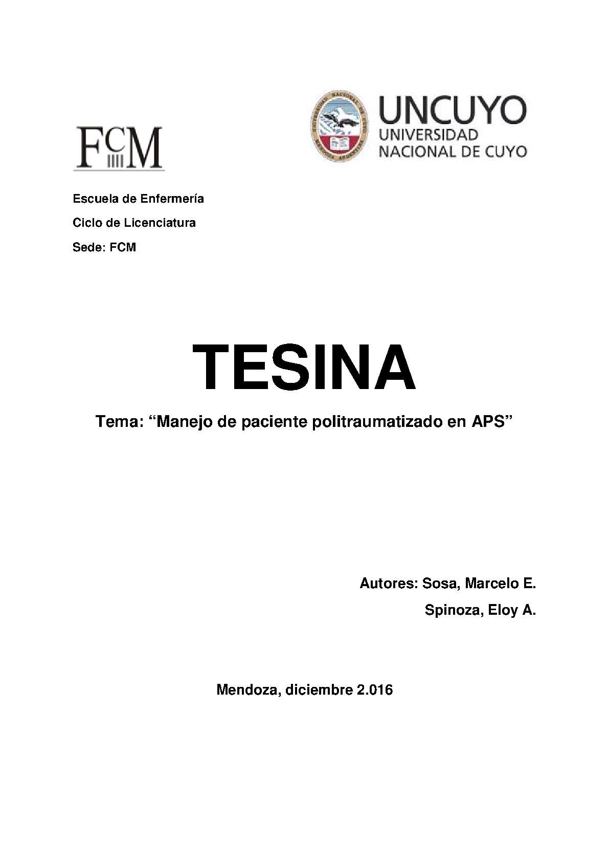 Los accidentes causan lesiones traumáticas y discapacidades inesperadas. En nuestro país, los accidentes viales, siguen siendo la primera causa de muerte por debajo de los 40 años de edad y la tercera causa para cualquier edad, siendo las dos primeras, las enfermedades cardiovasculares y el cáncer. El manejo y la asistencia del politraumatizado son descritos en orden secuencial con el propósito de clarificar conductas, esto no significa que no se puedan realizar varios actos simultáneamente. Así por ejemplo, mientras se evalúa al paciente desde el punto de vista respiratorio, circulatorio y neurológico, se puede indagar la historia y todos los eventos relacionados al accidente. El enfermero debe saber la sistemática diagnóstica del trauma e integrar sus conocimientos. El personal pre hospitalario y/o quien presta los primeros auxilios, en éste caso los enfermeros de atención primaria de salud (APS), es un componente importante en la historia del paciente, para evitar lesiones, secuelas y la muerte. Los centros de primer nivel de atención deberían tener un protocolo para el manejo de pacientes politraumatizados, lo que permitiría, que cuando se produce un accidente éste sea manejado de igual manera por el personal que se encuentra trabajando en ese momento, si no se cuenta con éste, en ocasiones lleva a la perdida de valiosos minutos, que son claves para la vida del paciente. Este trabajo de investigación tiene como objetivo determinar si los conocimientos y técnicas que aplican los enfermeros que trabajan en el Área Sanitaria de Tunuyán en atención y o manejo de pacientes politraumatizados guardan relación con los protocolos existentes en emergencia durante el segundo semestre del año 2016.