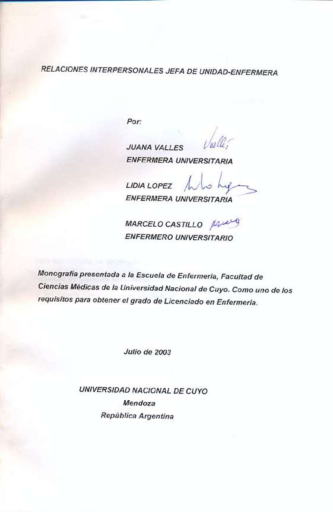 Valles, Juana; López, Lidia; Castillo, Marcelo. (2003). Relaciones interpersonales jefa de unidad-enfermera: (Tesina de grado). Mendoza, Universidad Nacional de Cuyo. Facultad de Ciencias Médicas. Escuela de Enfermería..