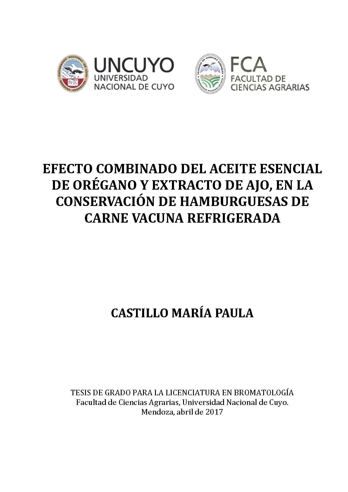 Castillo, María Paula. (2017). Efecto combinado del aceite esencial de orégano y extracto de ajo, en la conservación de hamburguesas de carne vacuna refrigerada: (Tesina de grado). Mendoza, Universidad Nacional de Cuyo. Facultad de Ciencias Agrarias .