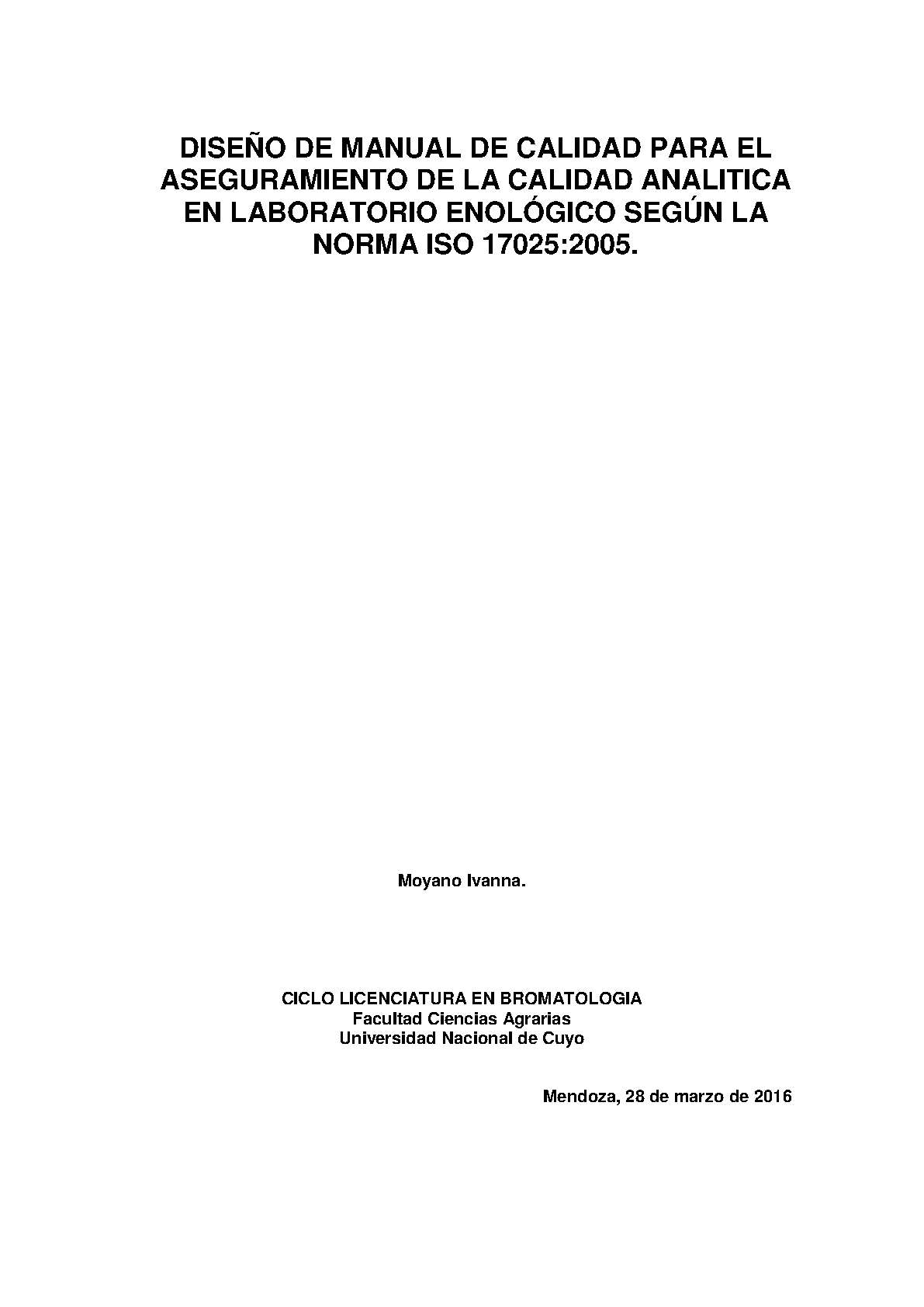 Diseño de manual de calidad para el aseguramiento de la calidad analítica en laboratorio enológico según la Norma ISO 17025:2005