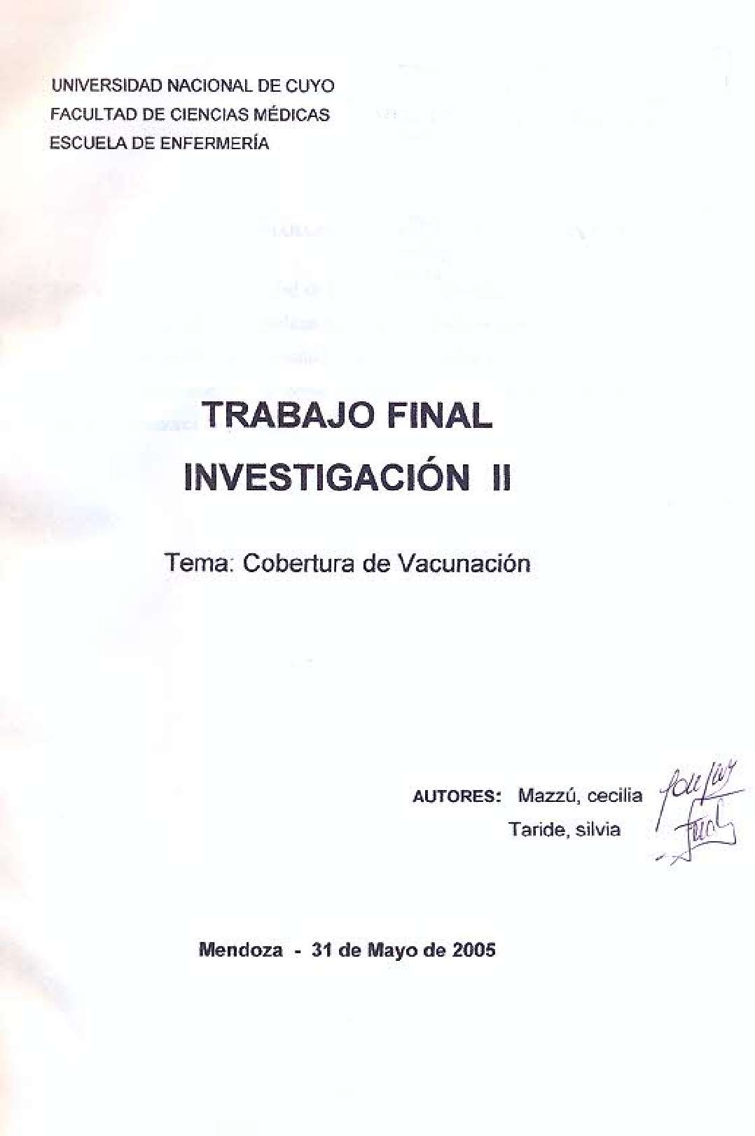 Mazzú, Cecilia; Taride, Silvia. (2005). Cobertura de vacunación: (Tesina de grado). Mendoza, Universidad Nacional de Cuyo. Facultad de Ciencias Médicas. Escuela de Enfermería..