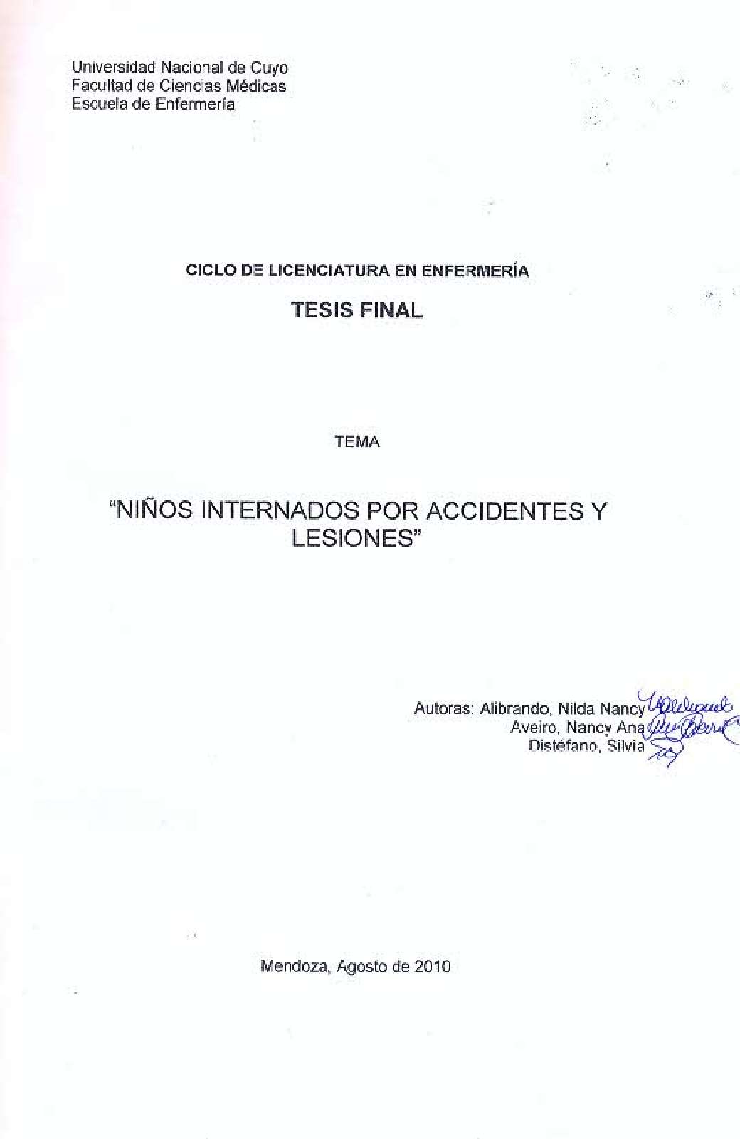 Los accidentes son una causa importante de morbilidad y mortalidad infantil, la mayoría de ellos se producen en los hogares, la vía publica, el colegio o los lugares de recreación. Estos accidentes pueden llegar a producir daños tan graves como la incapacidad total o parcial de las funciones orgánicas del paciente y hasta la propia muerte. Si bien se observan gran cantidad de accidentes, como por ejemplo quemaduras, accidentes viales, electrocución, traumatismos encéfalo craneanos, intoxicaciones, entre otros, se debe destacar que todos ellos son prevenibles. Es de vital importancia crear un eficaz modelo de prevención, conscientizando a toda la sociedad, comenzando en el propio hogar, y completándola en las escuelas, centros sanitarios y medios de comunicación. Este trabajo de investigación tiene como objetivo conocer los tipos de accidentes y lesiones que determina la internación de niños de 0 a 14 años en el hospital Humberto Notti, en los meses de febrero a abril de 2010; y determinar en qué medida dichos accidentes son prevenibles.