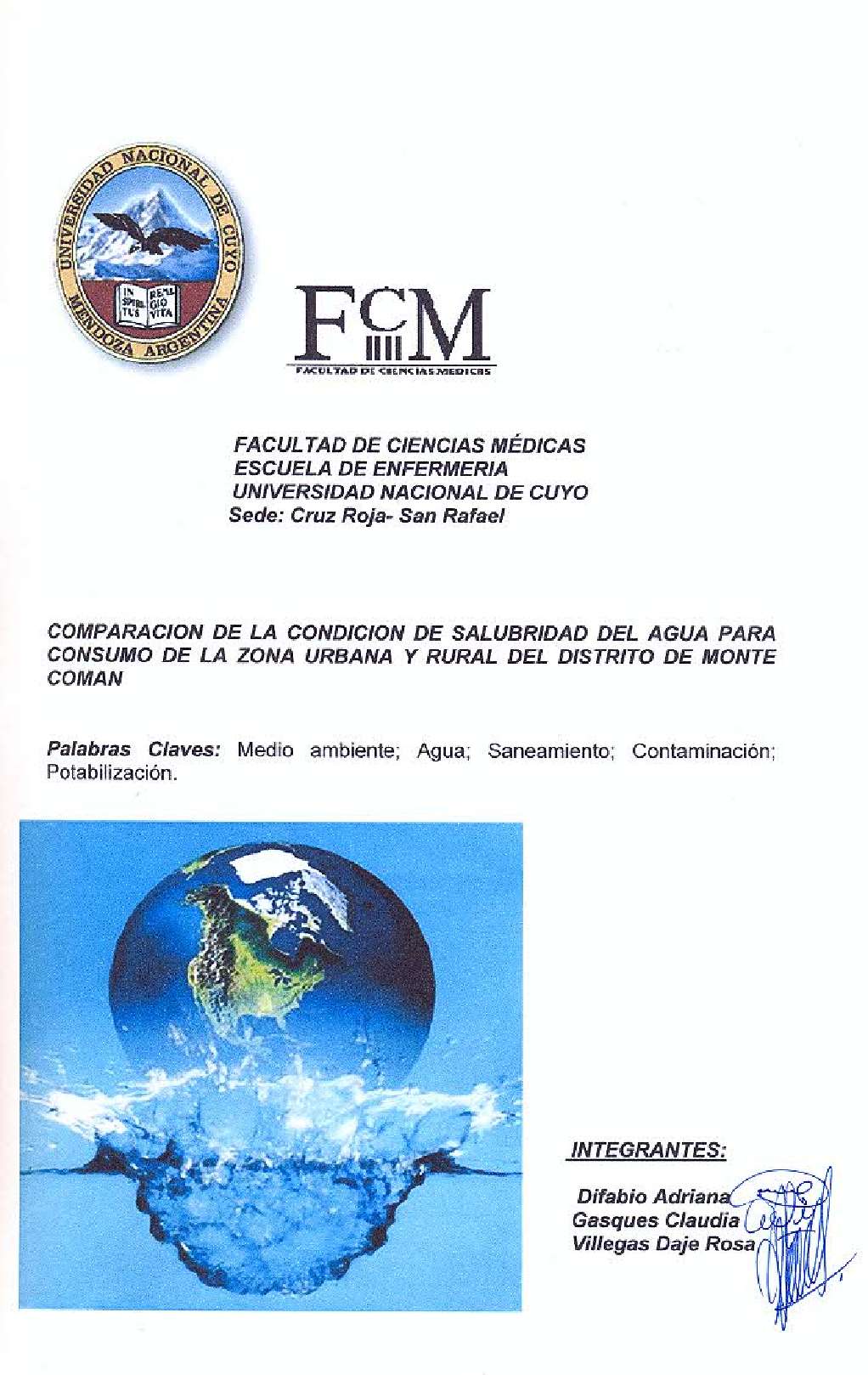 Si el agua no reúne las condiciones adecuadas para sus diversos usos, tanto en calidad como en cantidad, afectará seriamente la calidad de vida, la salud y el ambiente de una población. El uso del agua puede ser para riego de cultivos, para la industria, o para uso doméstico. Las principales fuentes de contaminación del agua son: aguas residuales domésticas, efluentes industriales y agrícolas, escurrimientos pluviales y agua de tormentas. La importancia de la potabilización del agua, es la de proteger a la población de los riesgos para la salud asociados a agentes biológicos (bacterias, parásitos, mosquitos, etc.) o químicos (turbidez, dureza, exceso de flúor, etc.) presentes en la misma. Uno de los principales problemas ligados a la confiabilidad del agua son las enfermedades gastrointestinales (diarreas) que tienen una taza importante de mortalidad, siendo las causa principales de esta problemática, la falta de agua potable, la escasa o precaria red cloacal, el poco control de los desperdicios domiciliarios, o la falta de condiciones higiénicas. Este trabajo de investigación tiene como objetivo comparar las condiciones de salubridad del agua de consumo en la zona urbana y rural del distrito Monte Comán, en San Rafael, Mendoza.