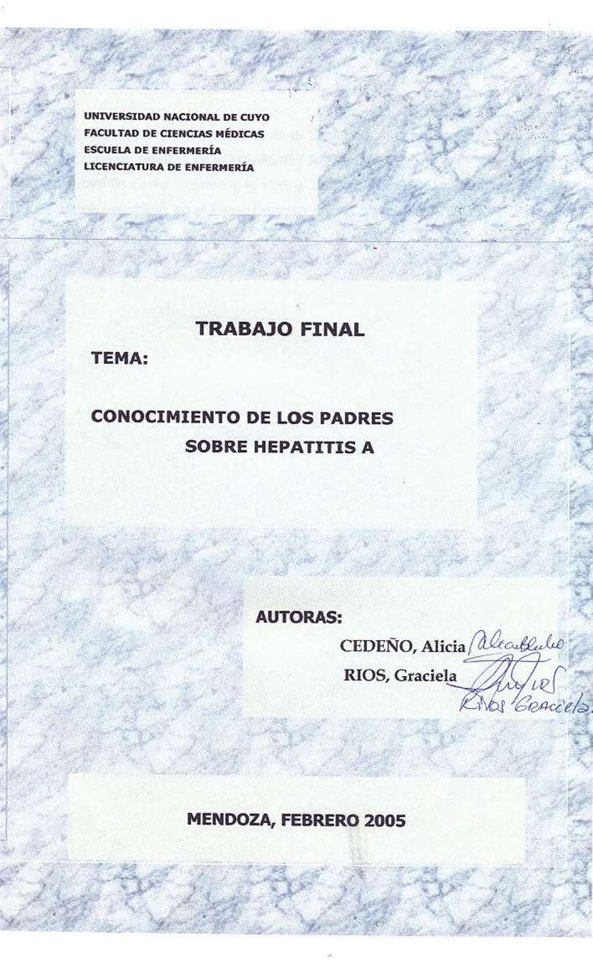 Cedeño, Alicia; Rios, Graciela. (2008). Conocimientos de los padres sobre Hepatitis A: (Tesina de grado). Mendoza, Universidad Nacional de Cuyo. Facultad de Ciencias Médicas. Escuela de Enfermería..
