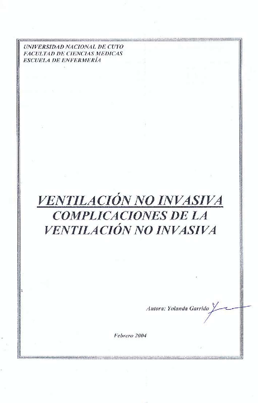 La asistencia ventilatoria mecánica es la creación de una vía área artificial, que garantiza la supervivencia de un gran número de pacientes con fallo respiratorio causados por enfermedades pulmonares. Esta asistencia suele ser agresiva y trae complicaciones, es por ello que se han buscado alternativas que tengan menos o ningún perjuicio para la salud del paciente. La ventilación mecánica no invasiva se refiere a un procedimiento de ventilación artificial en la cual no se utiliza para la conexión paciente-ventilador ningún implemento, como tubo endotraqueal o cánula de traqueotomía. La conexión paciente-ventilador se realiza por medio de una máscara que puede ser nasal o facial (nasal-bucal). Si bien la ventilación no invasiva se ha convertido en una alternativa eficaz en el tratamiento de la insuficiencia respiratoria, como cualquier técnica, no está exenta de limitaciones y complicaciones. Entre las primeras se destaca la necesidad de colaboración del paciente, además de una serie de contraindicaciones que limitan su uso, como traumatismos faciales, arritmias cardiacas, hemorragia digestiva alta, etc. El éxito de la técnica está condicionado a la correcta aplicación de la máscara, indispensable para asegurar una eficaz ventilación, junto con el control de fugas del circuito, etc. La utilización de la ventilación mecánica no invasiva de forma prolongada está asociada a varias complicaciones, entre las que se destacan lesiones tisulares por presión, sequedad de la mucosa nasal-bucal, intolerancia a la máscara, sensación de claustrofobia que se manifiesta como inquietud, ansiedad, agitación en los pacientes, entre otras. Este trabajo de investigación tiene como objetivo determinar cuáles son las complicaciones más frecuentes de la ventilación no invasiva en los pacientes internados en la terapia intensiva del adulto del Hospital Español, Godoy Cruz, Mendoza, en el trimestre, junio, julio, agosto de 2003.