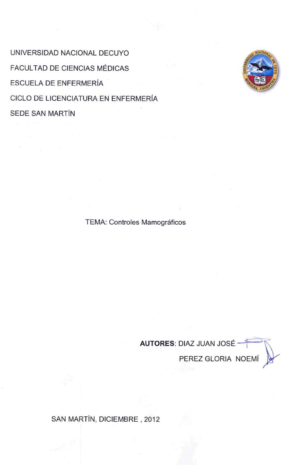 El cáncer de mama es una enfermedad, que ha ido aumentando con el transcurso de los años, por ello hay que detectarlo de manera oportuna. Es de conocimiento de todos, que el cáncer de mamas, afecta a un gran número de mujeres y en un porcentaje pequeño a los hombres. En este trabajo de investigación se estudia el cáncer de mama haciendo hincapié en las enfermeras del Hospital Central de Mendoza, es por ello que tiene como objetivo determinar cuál es la importancia que le dan a los controles mamográficos (autocuidado), las enfermeras de entre 40 y 55 años de consultorio externo, del primer y segundo piso de dicho hospital, en el segundo semestre de 2011 y el primer semestre de año de 2012.