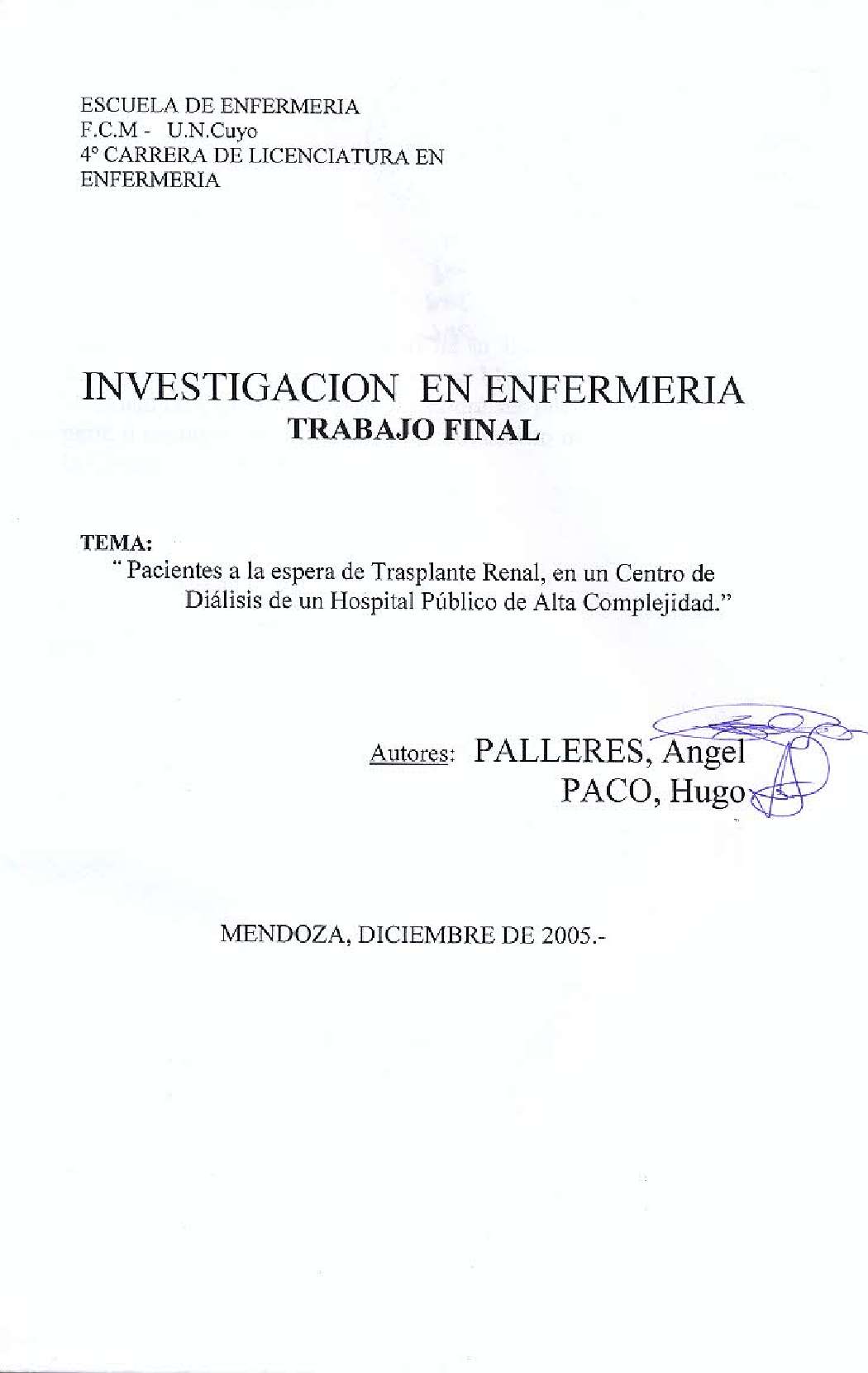 Se considera que un órgano es insuficiente cuando no es capaz de realizar correctamente la función que tiene asignada, el riñón desempeña tres funciones que son necesarias para el mantenimiento de la vida (eliminación de desechos, mantener el equilibrio de líquidos extracelulares, y función endocrina formador de hormonas). Cuando el paciente sufre de una insuficiencia renal grave, el único camino a seguir es un trasplante renal. En la actualidad los trasplantes renales han mejorado notablemente la calidad de vida de los pacientes y son muy pocos los que presentan algún tipo de rechazo a los órganos trasplantados. Los profesionales de enfermería intervienen en el post trasplantado brindándole información para el cuidado de la cirugía y la adaptación al tratamiento y a su nueva condición. El paciente debe ser estricto tanto en la asistencia a los controles como en tomar la medicación que le ha sido asignada. Este trabajo de investigación tiene como objetivo indagar en la realidad por la que deben pasar los pacientes a la espera de un trasplante renal y a su vez determinar cuál es el grado de expectativa sobre la evolución de la enfermedad y la satisfacción de los cuidados postrasplantes brindados por el equipo de salud, en el servicio de hemodiálisis del Hospital Central de Mendoza, en el año 2005.