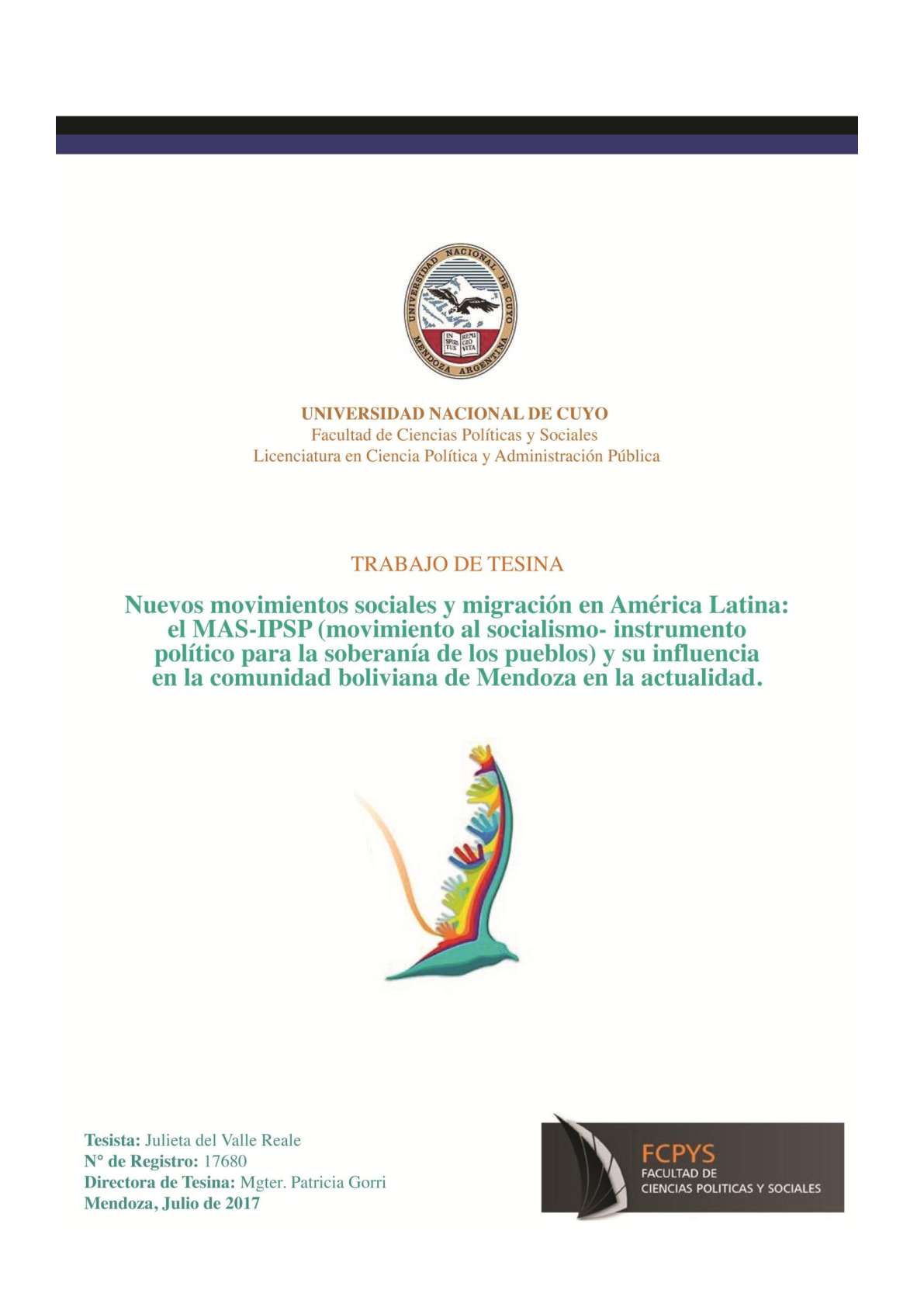 Reale, Julieta del Valle. (2017). Nuevos movimientos sociales y migración en América Latina: el MAS-IPSP (movimiento al socialismo - instrumento político para la soberanía de los pueblos) y su influencia en la comunidad boliviana de Mendoza en la actualidad (Tesina de grado). Mendoza, Universidad Nacional de Cuyo. Facultad de Ciencias Políticas y Sociales .