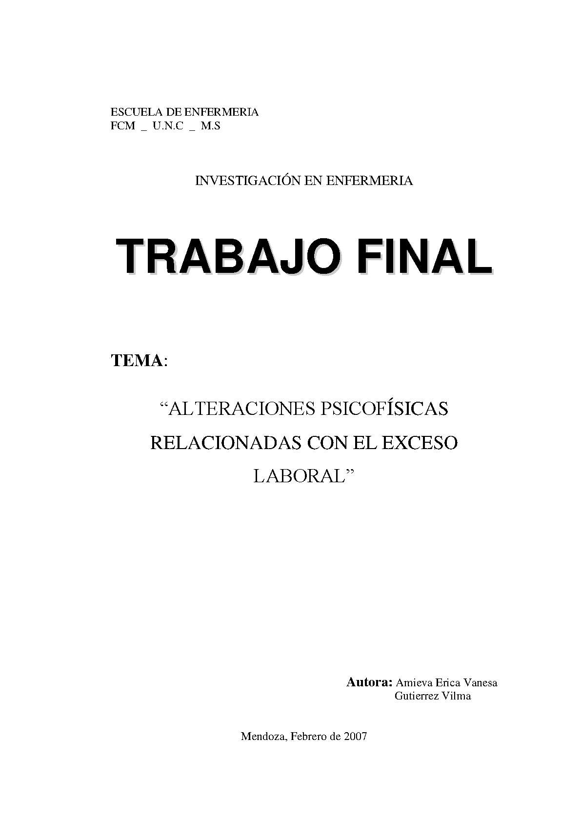 Amieva, Erica Vanesa; Gutiérrez, Vilma. (2007). Alteraciones psicofísicas relacionadas con el exceso laboral: (Tesina de grado). Mendoza, Universidad Nacional de Cuyo. Facultad de Ciencias Médicas. Escuela de Enfermería..