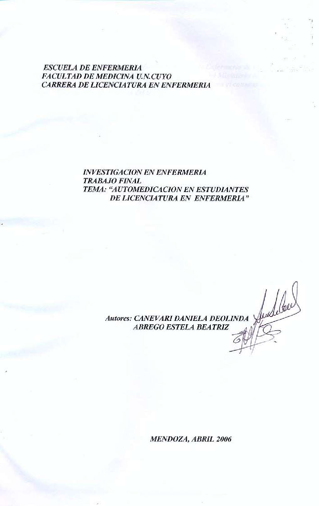Canevari, Daniela Deolinda; Abrego, Estela Beatriz. (2006). Automedicación en estudiantes de Licenciatura en Enfermería: (Tesina de grado). Mendoza, Universidad Nacional de Cuyo. Facultad de Ciencias Médicas. Escuela de Enfermería..