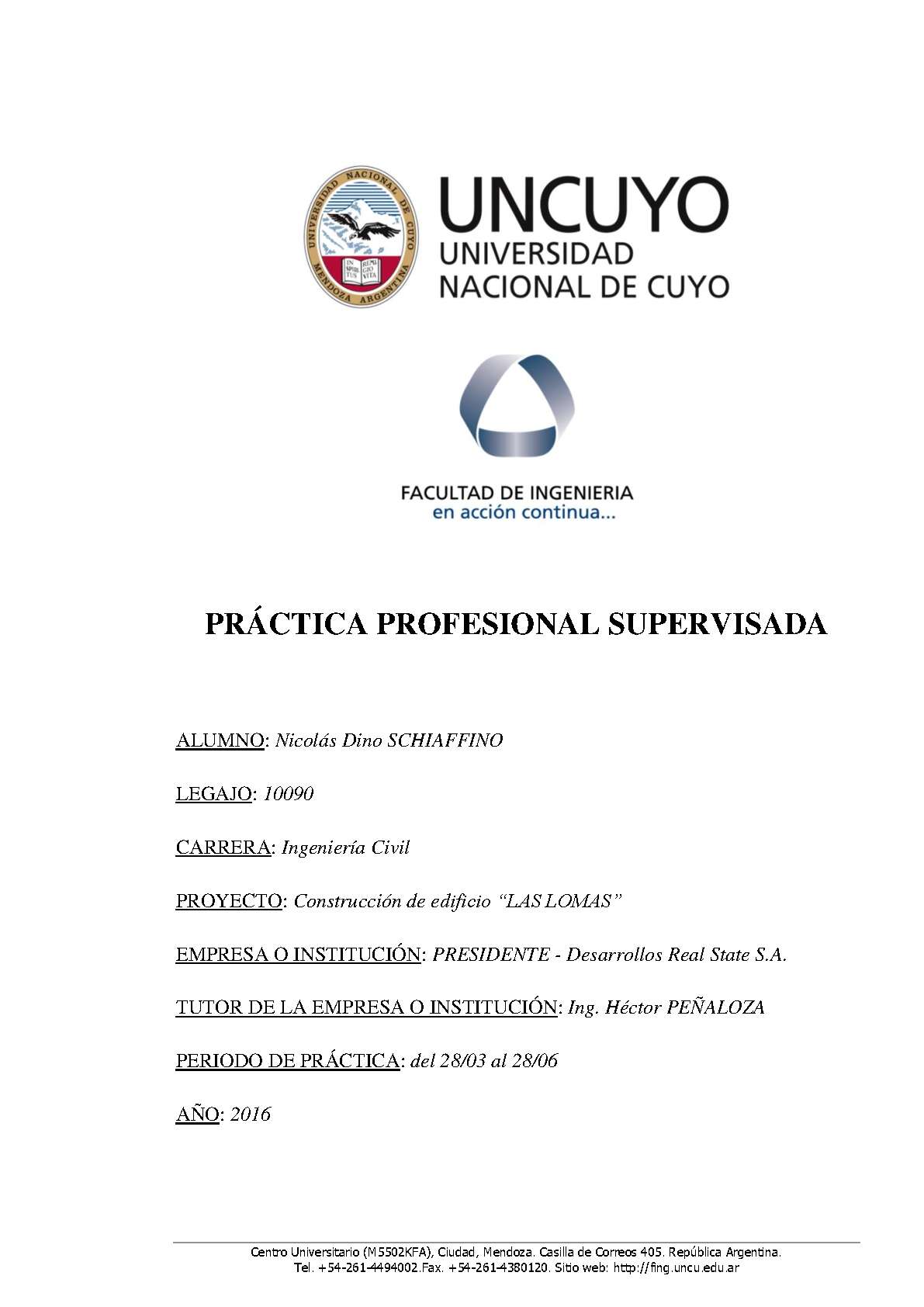 Schiaffino, Nicolás Dino. (2016). Construcción de edificio "Las Lomas": (Práctica Profesional Supervisada). Mendoza, Universidad Nacional de Cuyo. Facultad de Ingeniería .