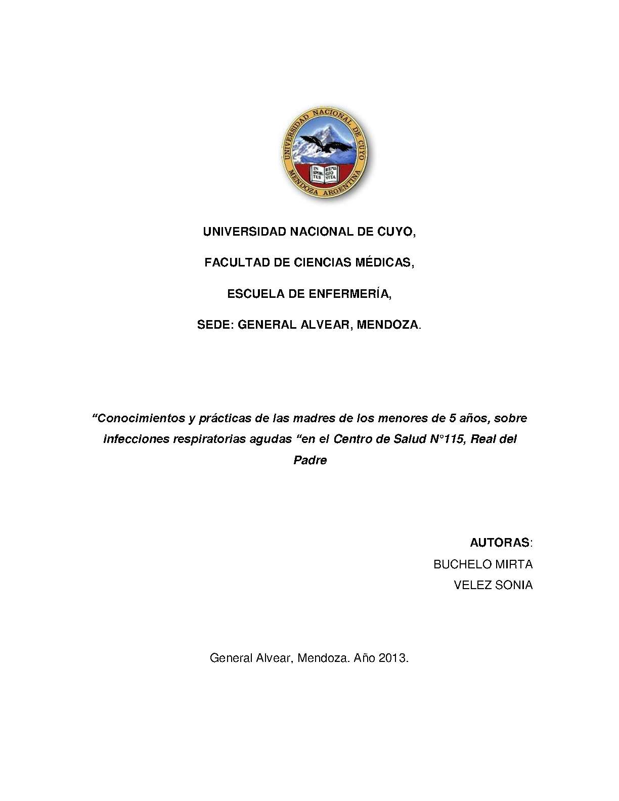 Entre las primeras causas de muerte en los niños menores de cinco años se encuentran las infecciones respiratorias agudas (IRA). Éstas representan un gran desafío para los servicios de salud en relación a la atención integral al niño. El personal de enfermería debe saber identificar en forma temprana los casos de infecciones respiratorias agudas y desde el rol de educador debe enseñar, mediante actividades de promoción de la salud dirigidas a los padres, el correcto manejo de las mismas en beneficio de la salud de los niños. La madre como principal responsable de la crianza y cuidado del niño, es la que identifica los síntomas, y debe conocer las medidas preventivas a tener en cuenta, considerando los conocimientos, actitudes y práctica de la misma brindados por el personal de salud. Esto llevará a reducir la morbi-mortalidad así como también las complicaciones de las IRA. Este trabajo de investigación tiene como objetivo determinar la relación que existe entre los conocimientos y prácticas que tienen las madres de los niños menores de 5 años que concurren al centro de Salud nº 115 Real del Padre, San Rafael, Mendoza durante el mes de julio de 2013, sobre medidas de prevención de infecciones respiratorias agudas.