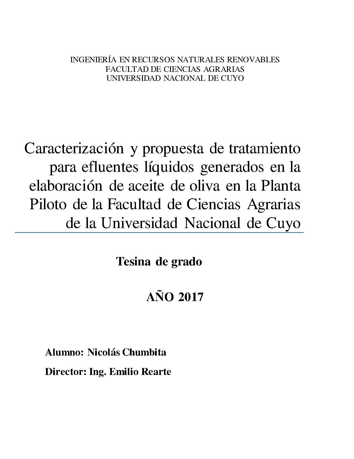 Caracterización y propuesta de tratamiento para efluentes líquidos generados en la elaboración de aceite de oliva en la Planta Piloto de la Facultad de Ciencias Agrarias de la Universidad Nacional de Cuyo