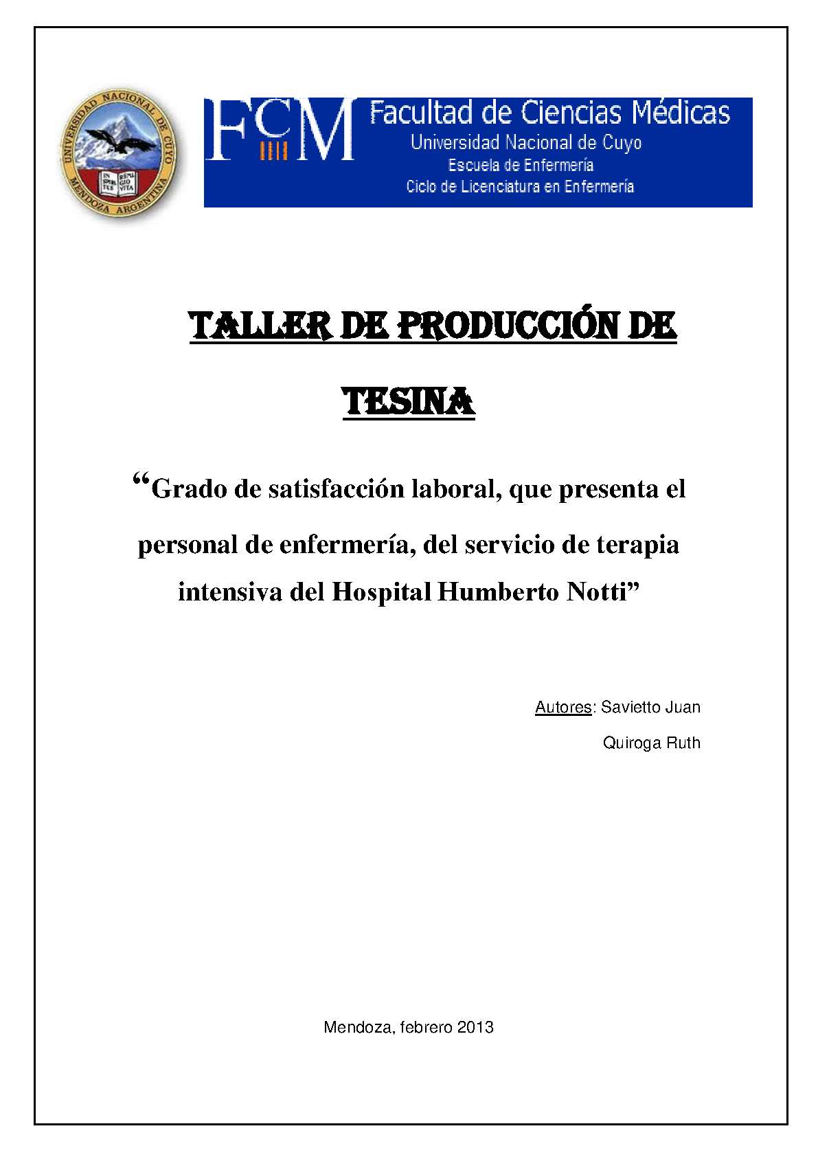La satisfacción laboral es la actitud favorable o desfavorable del individuo hacia su trabajo, un alto grado de satisfacción se puede ver reflejado en una actividad positiva hacia las actividades cotidianas. Los factores que determinan la satisfacción laboral son: un trabajo mental interesante, la equidad en los premios, las condiciones propias del trabajo y la buena relación con los colegas. Cuando hay insatisfacción, el personal genera ausentismo elevado, agresividad en el puesto de trabajo y bajo rendimiento. Es evidente que la satisfacción laboral tiene una estrecha relación con determinados aspectos del desempeño, puesto que no es factible conseguir que una persona realice su trabajo con calidad y eficiencia si no se encuentra satisfecho laboralmente. Algunos enfermeros no se sienten motivados con el trabajo cotidiano debido a diversos factores como, la alta complejidad del trabajo diario, las condiciones físicas de trabajo, la falta de recursos materiales y espacio físico, la falta de reconocimiento o incentivo laboral, el cumplimiento de recargos etc. A consecuencia de esto se advierte el aumento de partes médicos (psiquiátricos entre otros), desinterés en el trabajo que realizan, falta de cuidado personal, falta de comunicación o interacción con los pacientes y familiares, ambiente hostil entre médicos y enfermeros, desaliento para la participación en cursos y jornadas. Esto lleva a que su labor profesional se convierta en una carga y no como un ejercicio satisfactorio disminuyendo de esta manera su grado de satisfacción laboral. Este trabajo de investigación tiene como objetivo conocer cuál es el grado de satisfacción laboral que presenta el personal de enfermería, que trabaja en el servicio de terapia intensiva del Hospital Humberto Notti, durante los meses de julio a agosto, del año 2012.