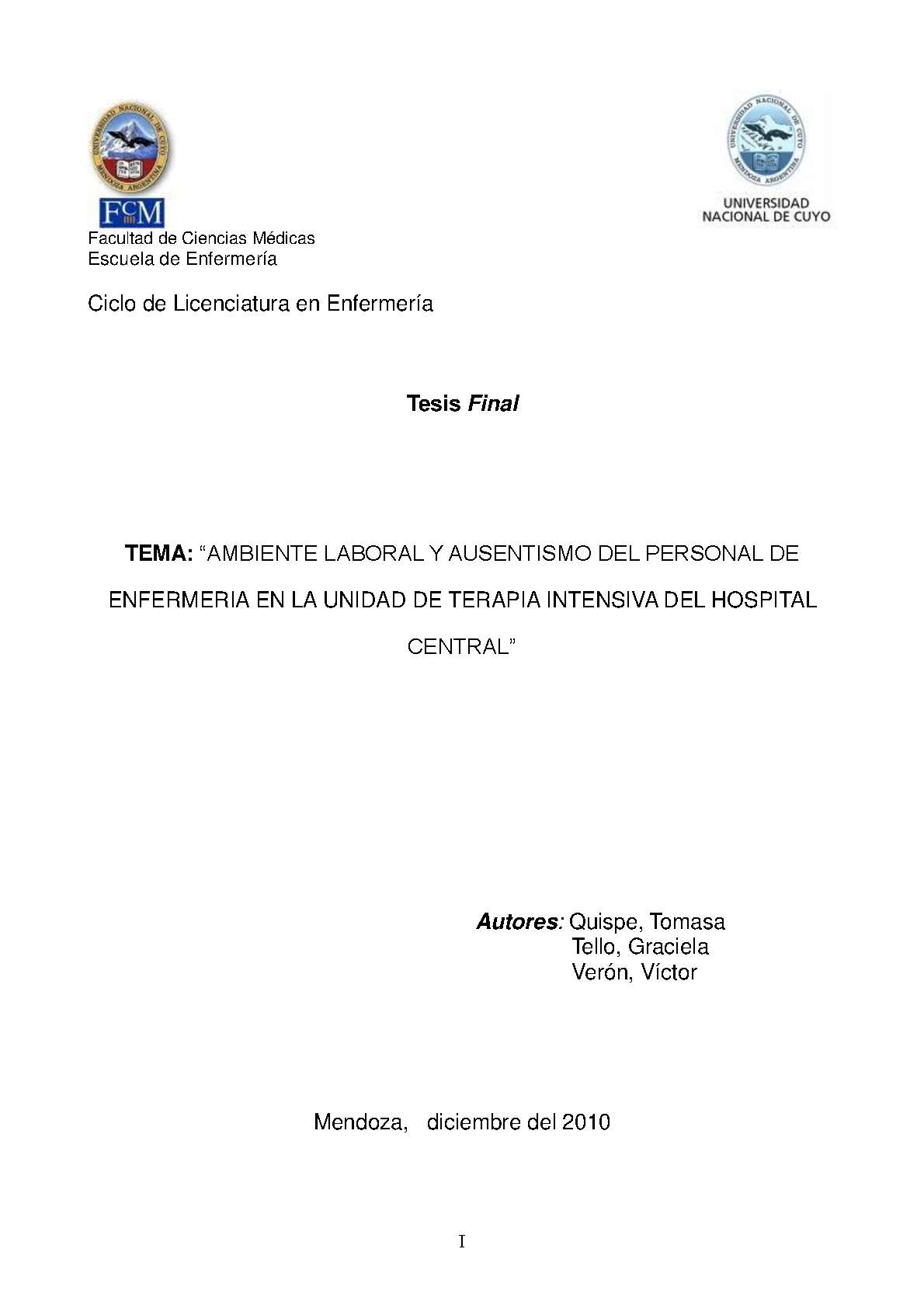 AMBIENTE DE TRABAJO - AUSENTISMO LABORAL - PERSONAL DE ENFERMERÍA - UNIDADES DE CUIDADOS INTENSIVOS - AGOTAMIENTO PROFESIONAL - SATISFACCIÓN EN EL TRABAJO - SALUD LABORAL - HOSPITAL CENTRAL (MENDOZA, ARGENTINA)