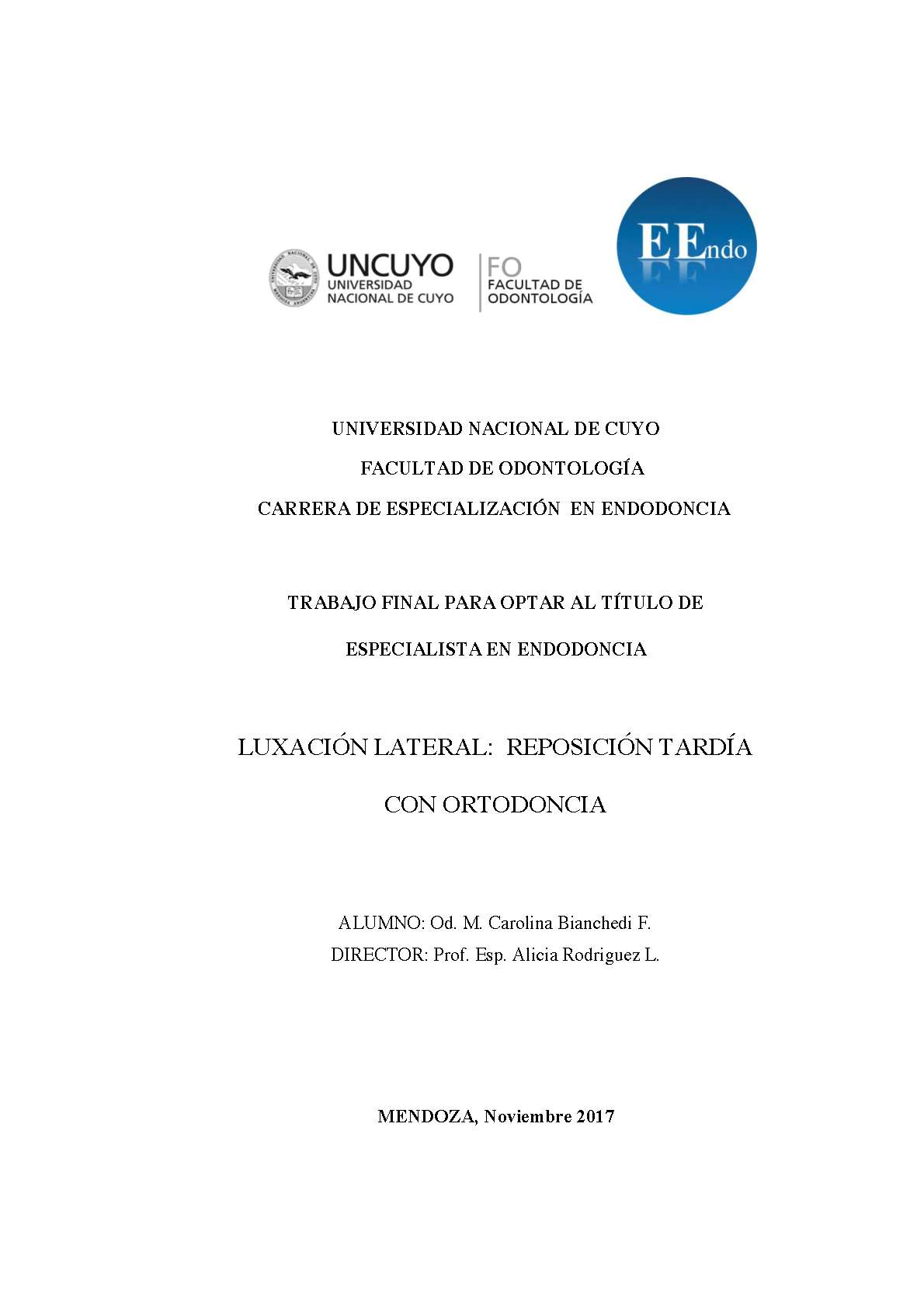 Bianchedi Ferrando, María Carolina. (2017). Luxación lateral: reposición tardía con ortodoncia (Trabajo final de especialización). Mendoza, Universidad Nacional de Cuyo. Facultad de Odontología .