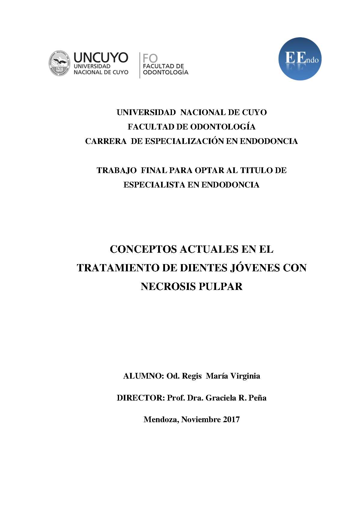 Regis, María Virginia. (2017). Conceptos actuales en el tratamiento de dientes jóvenes con necrosis pulpar: (Trabajo final de grado). Mendoza, Universidad Nacional de Cuyo. Facultad de Odontología .