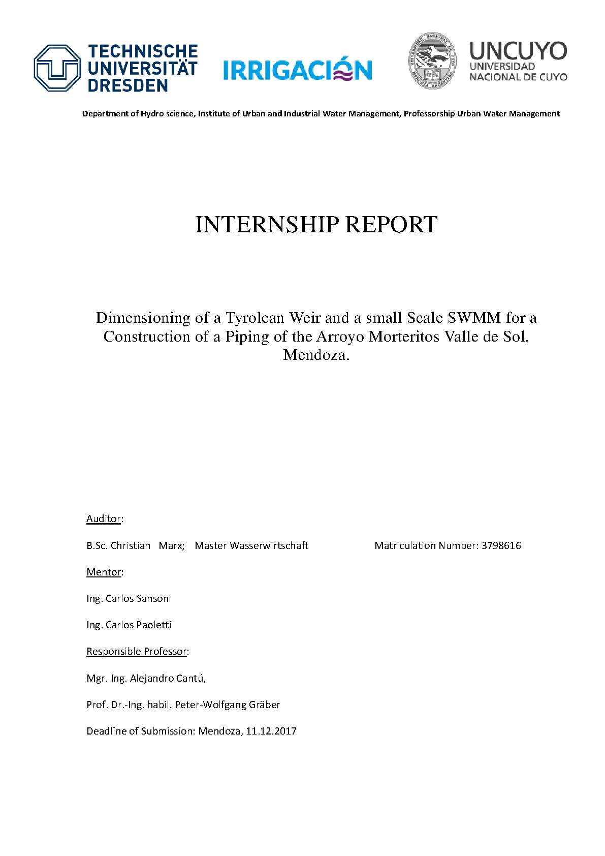 The objective of this paper is to set up and investigation of a Storm Water Management Model (SWMM) for the construction of a Tyrolean weir and piping in Valle de Sol, Mendoza. In the region, the Department of Irrigation wants to improve the irrigation of the village Las Vegas. An embankment of gravel and rocks separate the Arroyo Morteritos with the Arroyo Alumbre and relocate the confluence ca. 2 km downstream, to ensure a good water quality for the irrigation. This is necessary, be-cause the quality and turbidity of the Arroyo Alumbre is not sufficient and as good as the water from Arroyo Morteritos. A Tyrolean weir will be constructed for draining the Arroyo Morteritos into the tube. For protecting the tube of flood events, it will be covered by a relocated earth embarkment. Latter is planned as a discharge of the flood over the dyke, directly into the Arroyo Alumbre.