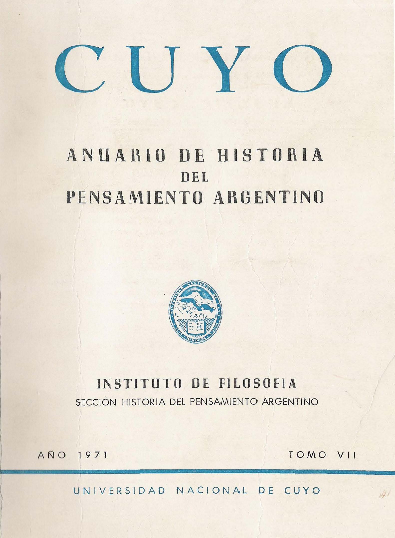 CUYO is a yearly publication of the Institute of Argentine and American Philosophy (the American Continent as a whole) of the Faculty of Philosophy and Literature of Cuyo University (Mendoza, Argentina). This publication contains research papers on Philosophy, History of Argentine and American Philosophy, History of American Ideas, and related disciplines. In its “Texts” section, it recovers for publication unpublished writings and ancient works and documents. Since 1965, CUYO has provided a space for the exchange of opinions and critical analysis with a scientific note, addressed not only to the specialized reader but also to the general public. This publication is included in the Handbook of Latin American Studies of the Library of Congress, in the Directory of Social Sciences and in the Latindex. Every opinion expressed here by the authors is their own responsibility.