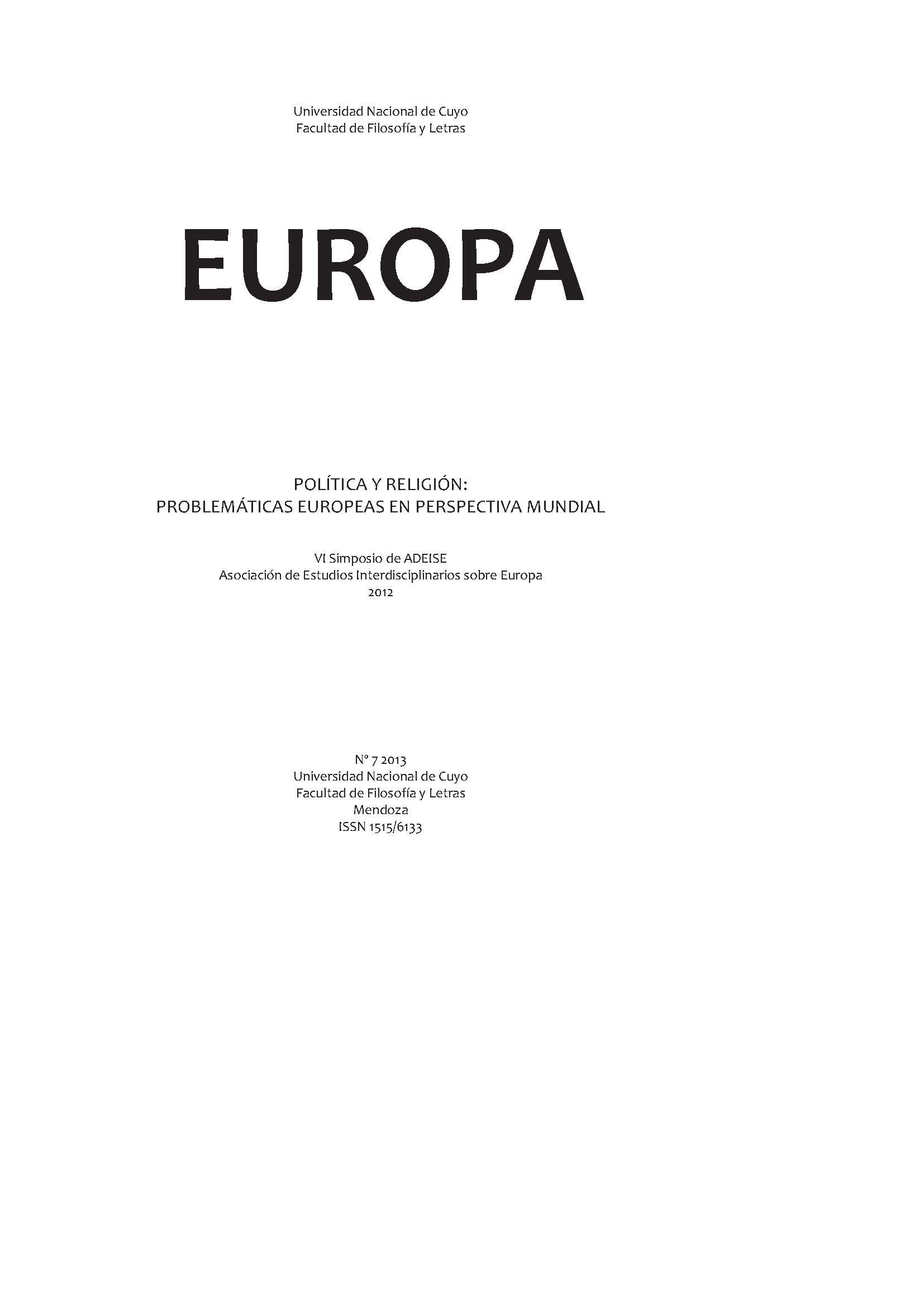En torno a la temática de Política y Religión: problemáticas europeas desde una perspectiva mundial, se dio comienzo al VI Simposio de la Asociación de Estudios Interdisciplinarios sobre Europa (ADEISE) entre el 11 y 13 de abril de 2012, en la sede de la Facultad de Filosofía y Letras de la Universidad Nacional de Cuyo. Creada en 2000, ADEISE organiza con una regularidad bianual en Mendoza estos eventos científicos y busca, a partir de distintos tópicos de análisis, revalorizar los lazos que nos unen con el continente europeo y potenciar instancias de acercamiento y diálogo entre actores nacionales y extranjeros que, desde las diversas esferas del conocimiento, intentan propiciar el encuentro cultural. A través de la organización de dichos Simposios y de acuerdo con su carácter interdisciplinar, ADEISE pretende invitar a investigadores de diferentes especialidades a "pensar en Europa" desde una mirada multifocal. Este objetivo común y mantenido en el tiempo implica revivir los hitos fundamentales de su devenir histórico y cultural, desde la admiración que despierta la excelsa Grecia, paradigma emblemático de ἀρετή y σωφροσύνη, pasando luego por la fáctica Roma, ordenadora del orbe, por la acción transformadora de la Christianitas, hasta llegar, a través del esplendor renacentista, a la intensa vivencia de la Contemporaneidad. Como resultado de las investigaciones presentadas en dicho evento surge el presente número de la Revista Europa, estudios avalados por prestigiosos referatistas del país y del extranjero, a quienes se agradece la estricta labor académica llevada a cabo con esmero y eficiencia. Esta publicación se encuentra organizada en dos partes en las que se incorporan tanto conferencias como ponencias expuestas en el mencionado Simposio. Dichas producciones evidencian el alto rigor científico de sus autores así como el interés que despiertan las temáticas europeas en el ámbito académico y científico actual. A través de esta nueva publicación ADEISE procuradar a conocer la labor realizada hasta el presente en su afán de fomentar y difundir la vigencia de los estudios europeos y sus problemáticas desde una perspectiva abarcadora y mundial.