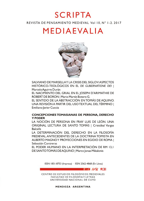 Scripta Medievalia es una publicación periódica, de frecuencia semestral, que reúne trabajos de investigación originales,textos e información sobre el pensamiento medieval. Scripta Medievalia integra el núcleo básico de publicaciones científicas argentinas y es reseñada e indexada en: International Medieval Bibliography, Repertorio de Medievalismo Hispánico, Medioevo Latino y Latindex. Scripta Medievalia integra el Repositorio Bibliográfico de la Universidad Nacional de Cuyo: http://bdigital.uncu.edu.ar/ Este volumen se publica gracias a un subsidio de la Secretaría de Ciencia y Técnica de la Universidad Nacional de Cuyo.