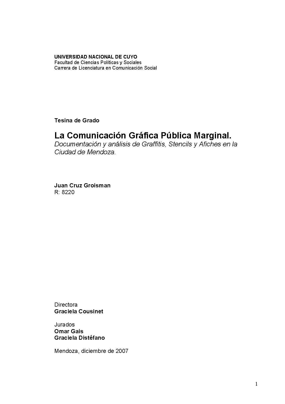 Groisman, Juan Cruz. (2007). La comunicación gráfica pública marginal: documentación y análisis de graffitis, stencils y afiches en la ciudad de Mendoza (Tesina de grado). Mendoza, Universidad Nacional de Cuyo. Facultad de Ciencias Políticas y Sociales .