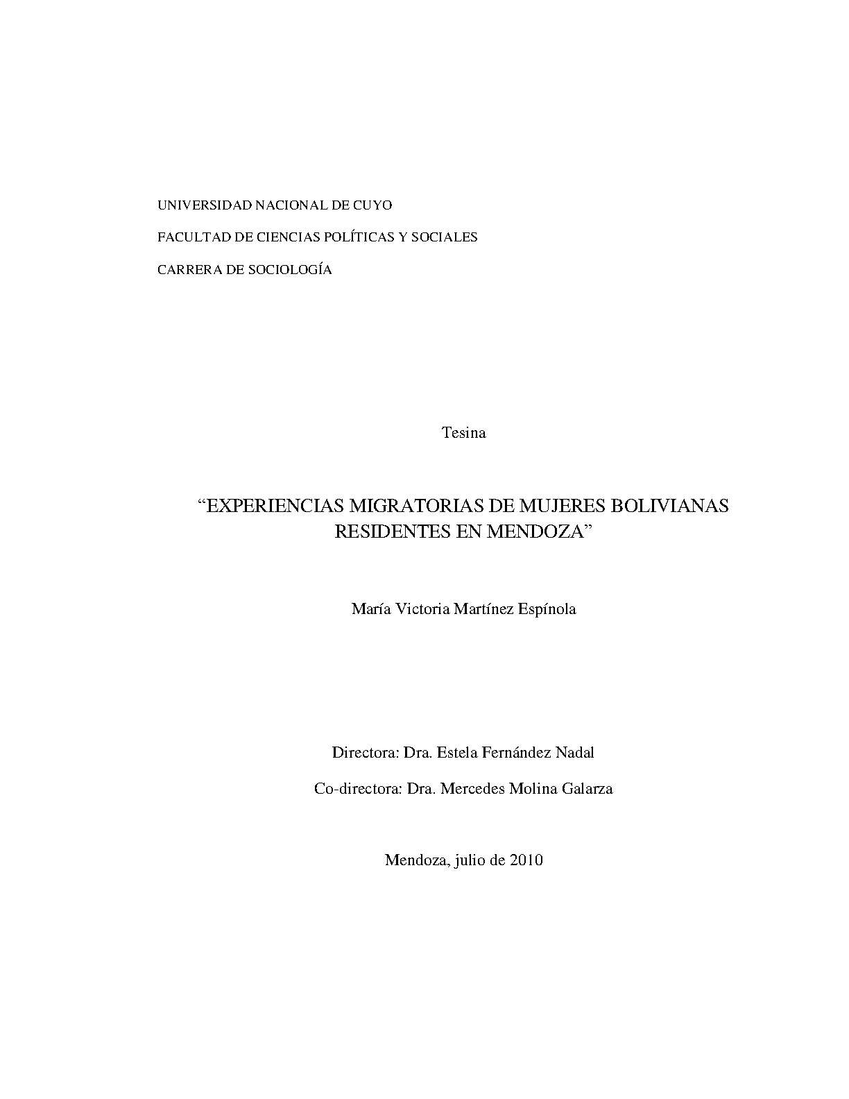 Experiencias migratorias de mujeres bolivianas residentes en Mendoza