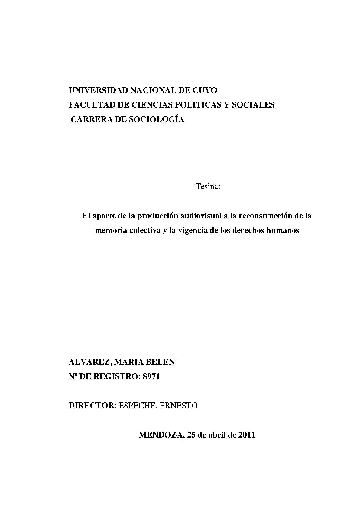 Álvarez, María Belén. (2011). El aporte de la producción audiovisual a la reconstrucción de la memoria y la vigencia de los derechos humanos: (Tesina de grado). Mendoza, Universidad Nacional de Cuyo. Facultad de Ciencias Políticas y Sociales .